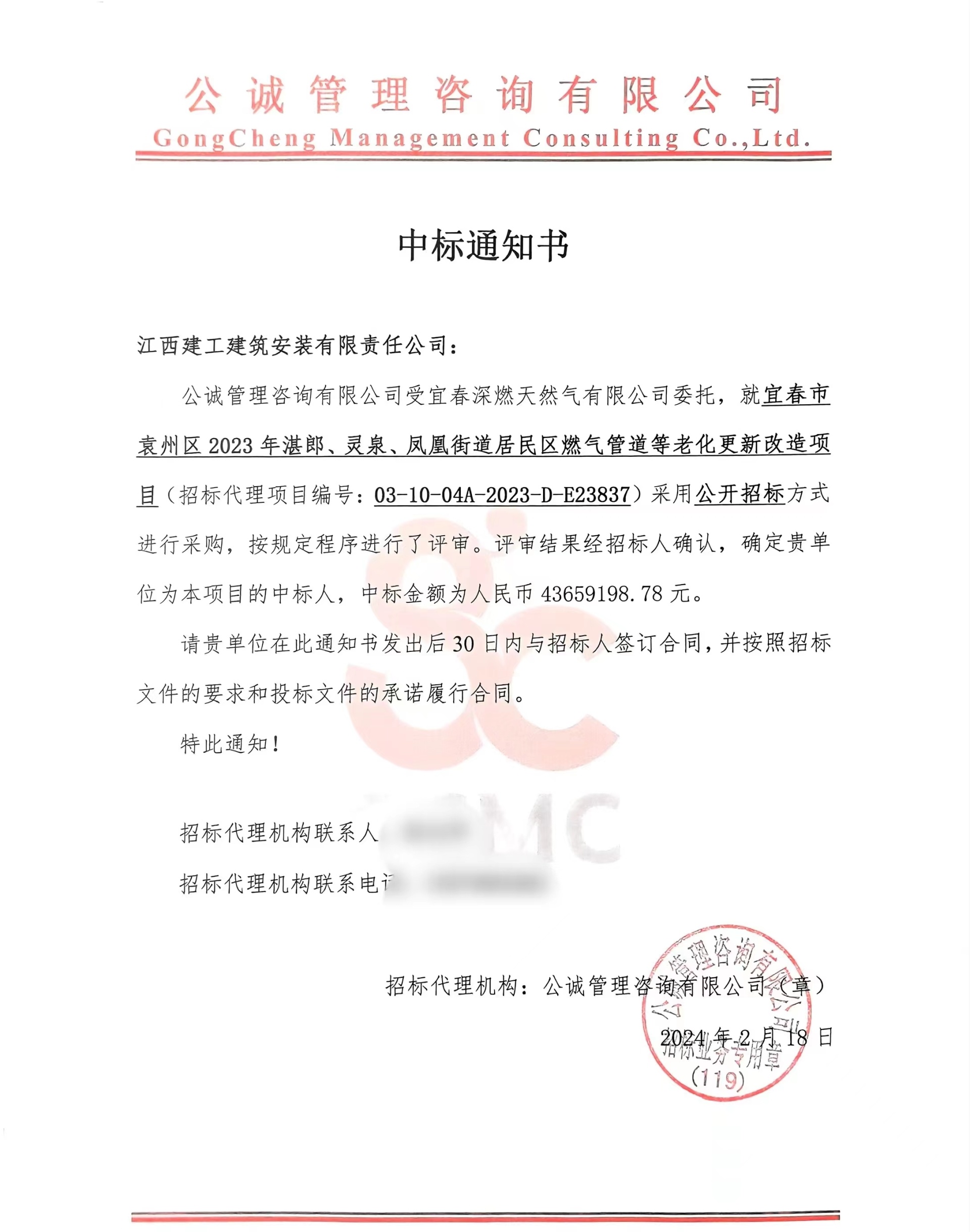 2024年2月,江西建工安装中标宜春市袁州区2023年湛郎、灵泉、凤凰街道居民区燃气管道等老化更新改造项目,该项目中标价约 4365万元。