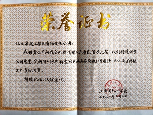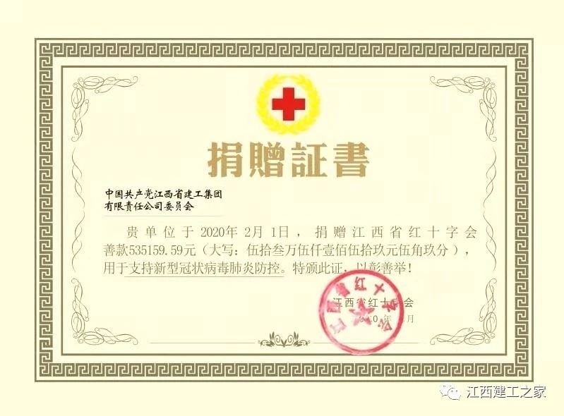 近年来,江西建工肩负新时代国有企业的使命担当,始终不忘回馈社会的重要责任。在举国上下抗击新冠肺炎疫情的关键时刻,集团公司积极响应省委省政府、省国资委的号召,积极贯彻落实“疫情就是命令,防控就是责任”的重要指示精神,积极承担省属国企的责任和担当,踊跃捐赠,贡献力量,为抗战疫情一线提供有力的物质保障和精神动力。