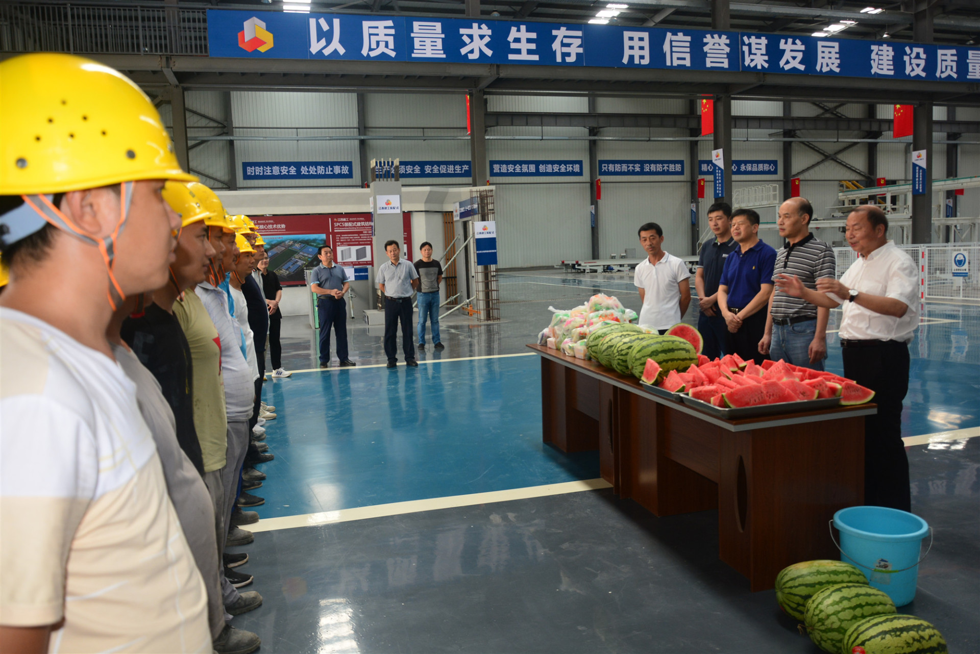 8月11日下午,江西省总工会党组成员、副主席任春山一行带着防暑降温物品,走访慰问了奋战在江西建工集团建设产业投资有限公司装配式车间和新型材料科技有限公司建设项目基地的干部职工,为高温下坚守工作岗位的一线的职工,送去了清凉、送去了关爱。江西建工集团副总经理、工会主席刘小宜,安义县人大常委会副主任、党组书记、总工会主席刘健力等一同慰问,并就工会在关心关爱职工,助推企业高质量发展等方面工作进行了交流。